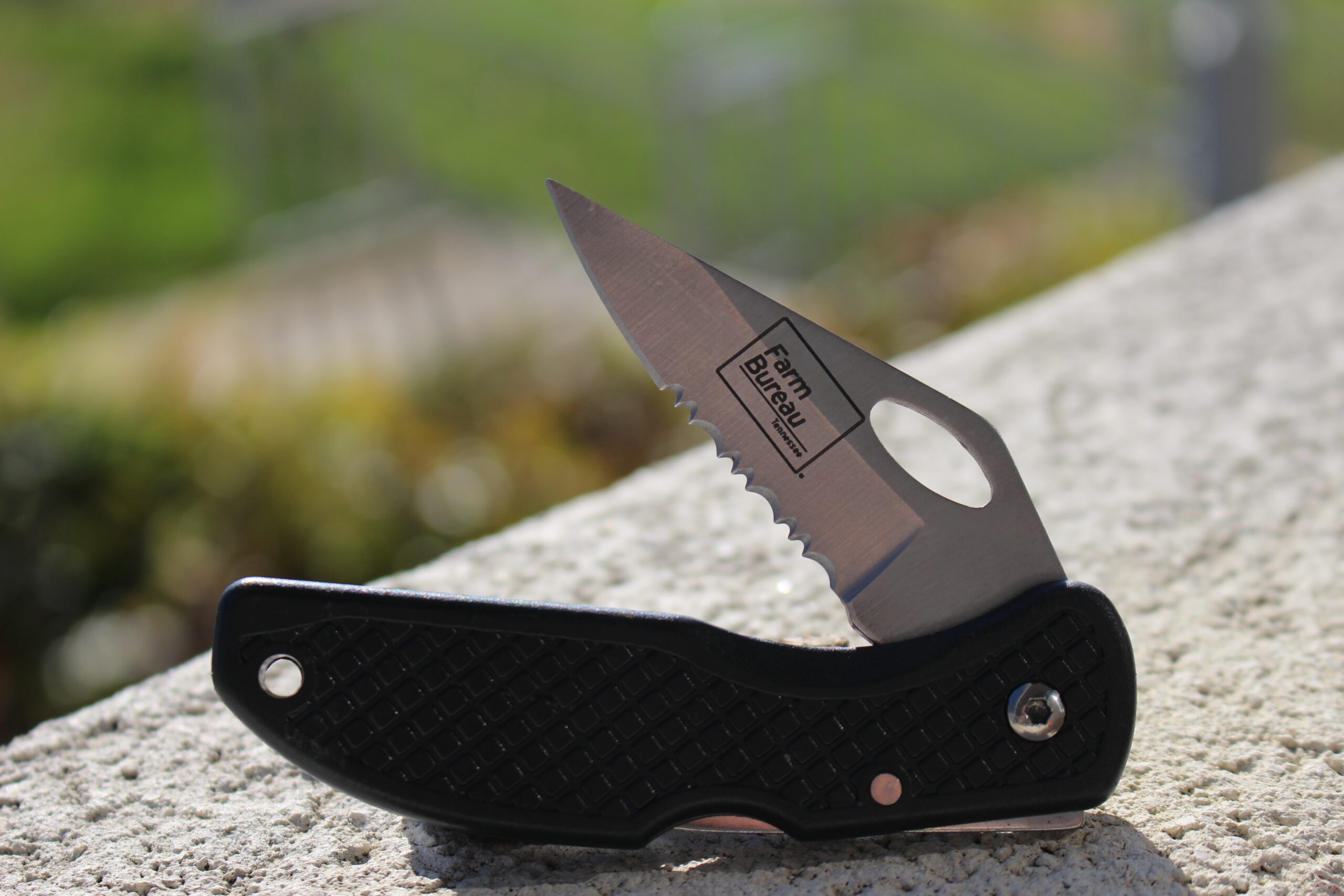Cutting edge knife with Farm Bureau red box logo included on blade