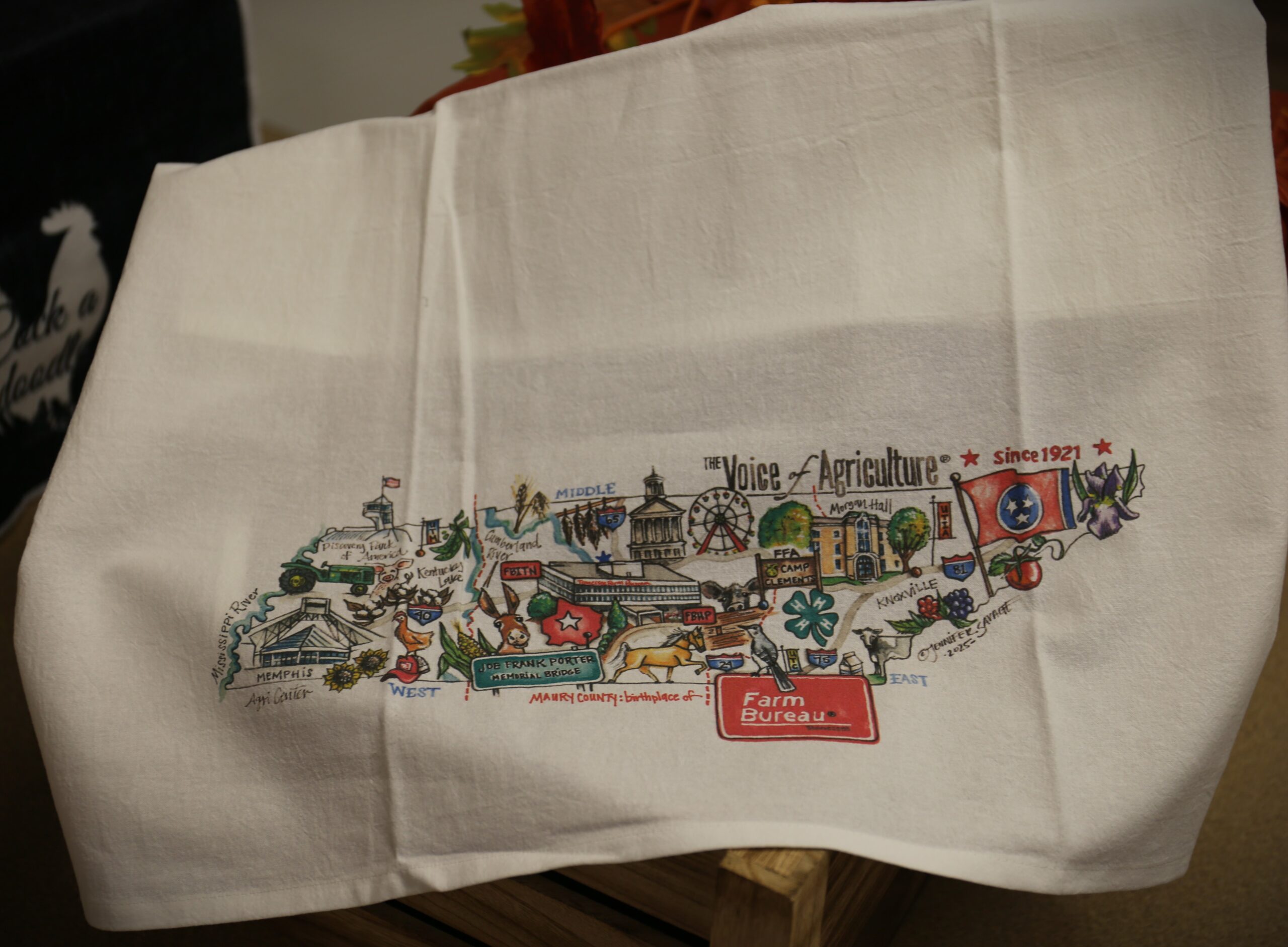 Add a touch of Southern charm to your kitchen with this beautifully illustrated tea towel featuring a watercolor map of Tennessee agriculture on a 27″ x 27″ 100% cotton flour sack. The design highlights the state’s rich farming heritage depicting key commodities and iconic rural landmarks.